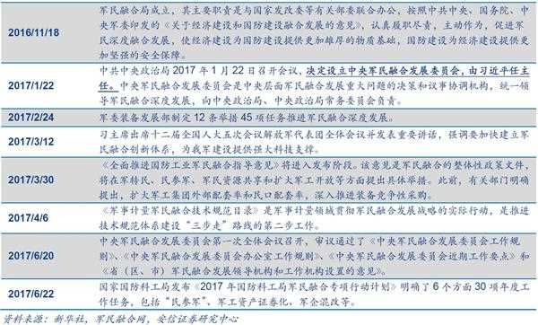 军民融合持续受到高层支持。中共中央政治局2017年1月22日召开会议,决定设立中央军民融合发展委员会,由习近平任主任。中央军民融合发展委员会是中央层面军民融合发展重大问题的决策和议事协调机构,统一领导军民融合深度发展,向中央政治局、中央政治局常务委员会负责。军民融合领导层架构已经落地,预示今年军民融合产业发展将进入高速发展期。