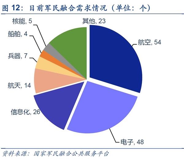 民企在航空,电子,信息化参与度高:全军武器装备采购信息网2015年上线,民企获得军方订单,军地沟通更顺畅,军民协调更透明。目前,我国民营资本在航空,电子和信息化上已经达到了较高的技术水平,其完全有能力承接国防信息化的产品制造和科研任务。根据我们对军民融合动态的监测,国防信息化也是军工需求最大和民企参与最多的领域。在国家军民融合公共服务平台发布的181项军民融合的需求中,航空,电子和信息化方面的需求分别为54,48和44项,合计占到总需求项目的70%。而根据我们对民参军企业行业分布的统计也显示,计算机、通信、电子设备制造和信息化服务企业也占比超过一半。