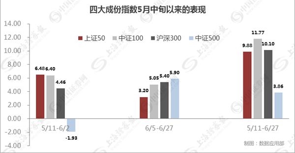 从6月5日至本周二,上证50、中证100、沪深300、中证500涨跌幅分别为3.20%、5.05%、5.40%、5.90%,而从5月11日到6月2日期间的涨跌幅分别为6.48%、6.40%、4.46%、-1.93%。可以看到,沪深300和中证500的表现明显后来居上,尤其是中证500的表现更为突出——从前一区间的逆市下跌到目前阶段的领涨两市。这表明“漂亮50”行情确实已经扩散,市场风格正在从以上证50和中证100为代表的一线价值蓝筹股拓展到以中证500为代表的二线价值成长股。