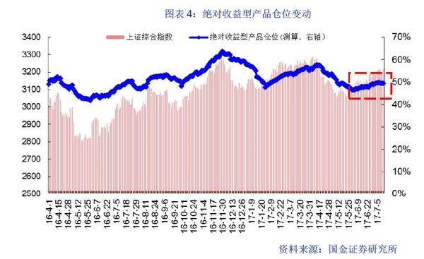 截至7月13日,本期跟踪的主要管理类产品,“股票型产品、混合型产品、绝对收益型产品”仓位变动分别为0.10%、0.29%、-0.30%;从仓位变动的路径来看,五个交易日机构仓位波动较小,但低波动率态势未变。