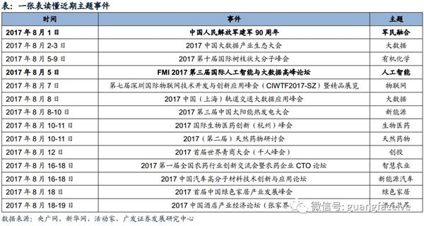 本周重要主题事件包括:2017年8月1日中国人民解放军建军90周年(军民融合)和2017年8月5日FMI 2017第三届国际人工智能与大数据高峰论坛(人工智能)等。