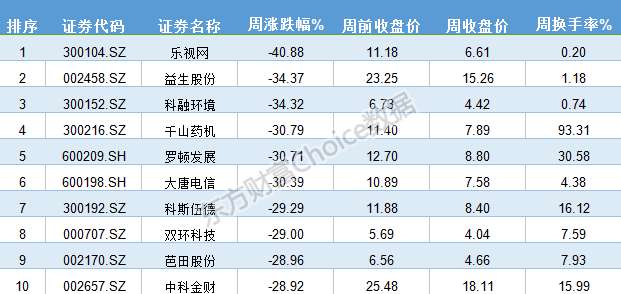 东方财富Choice数据显示,本周跌幅排名前十位的个股分别为:乐视网(300104)、益生股份(002458)、科融环境(300152)、千山药机(300216)、罗顿发展(600209)、大唐电信(600198)、科斯伍德(300192)、双环科技(000707)、芭田股份(002170)和中科金财(002657)。ST保千里(600074)虽然继续着跌停榜纪录,但由于其每日跌幅为5%,并未进入前十榜单。