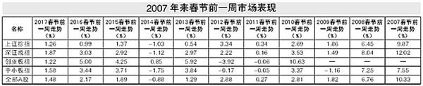 随着昨日沪深两市出现企稳回升,令市场重新期待A股春节前会否出现红包行情。记者统计2007年来春节前一周的市场走势发现,A股派发红包是大概率事件——沪指、深成指只有2014年下跌,上涨概率超九成;创业板开板来仅2011年、2012年下跌,上涨概率75%;如果观察区间放宽到节前两周,沪指、深成指更是无一下跌。