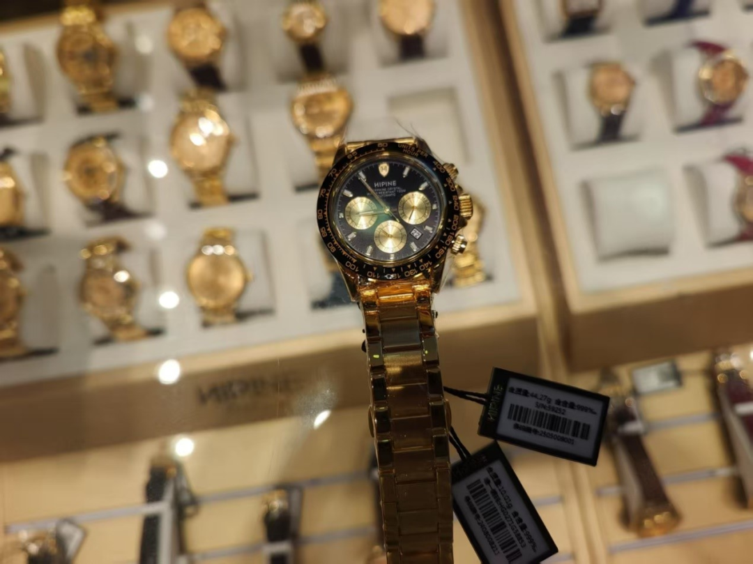 6月9日午间,在深圳水贝的兴龙黄金珠宝大厦一层,中国证券报记者看到,一家西普尼经销商店铺柜台里展示着各式各样的西普尼金表。记者现场了解到,该店铺内的西普尼金表,贵的售价为4万多元,便宜的售价为2300多元,售价高低和黄金重量直接相关。