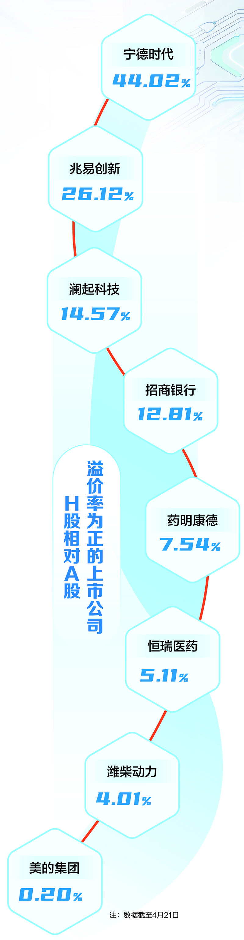 与这一趋势相呼应的是,恒生沪深港通AH股溢价指数持续下行。在AH股整体溢价收窄的背景下,硬科技板块溢价逆势凸显。截至2026年4月21日收盘,澜起科技、兆易创新H股溢价率均超14%,药明康德、恒瑞医药H股溢价率亦均超5%,凸显全球资本正加速向具备核心竞争力的中国硬科技资产集聚。