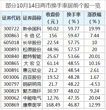 首页>市场>A股市场 100股换手率超20% 5股换手率达五成以上 证券时报网2020-10-14 20:34 证券时报 数据宝统计,今日100只个股换手率超过20%,其中,新余国科、卡倍亿等5只个股换手率达五成以上,半数筹码易主。