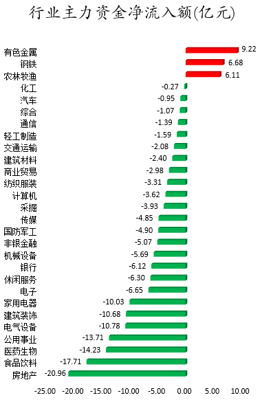 从行业板块来看,申万所属的28个一级行业,今日仅有有色金属、钢铁、农林牧渔3个行业板块主力资金呈现净流入,净流入金额分别为9.22亿元、6.68亿元、6.11亿元。25个行业板块主力资金呈现净流出,其中,房地产行业板块主力资金净流出最多,净流出金额为20.96亿元;行业板块主力资金净流出靠前的还有食品饮料、医药生物、公用事业、电气设备、建筑装饰,净流出金额分别为17.71亿元、14.23亿元、13.71亿元、10.78亿元、10.68亿元。