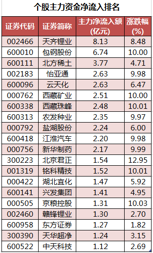 个股来看,今日有1768只个股获主力资金净流入,其中,24股获主力资金净流入超1亿元。天齐锂业获主力资金净流入最多,净流入金额为8.13亿元;主力资金净流入居前的个股还有包钢股份、北方稀土、怡亚通、云天化、西藏矿业,净流入金额分别为6.74亿元、3.77亿元、2.63亿元、2.63亿元、2.51亿元。