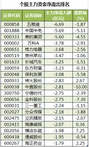 此外,2882只个股被主力资金净卖出,其中,52股被主力资金净卖出超1亿元。主力资金净流出最多的个股是五粮液,净流出金额为6.69亿元;主力资金净流出居前的个股还有中国中免、美的集团、万科A、格力电器、贵州茅台,净流出金额分别为5.69亿元、5.6亿元、3.78亿元、3.68亿元、3.47亿元。