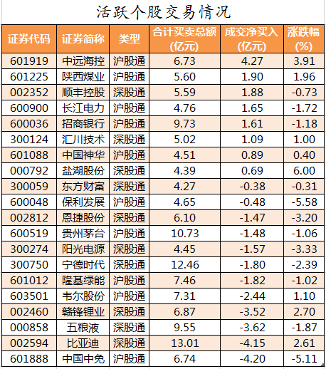 活跃个股方面,北向资金净买入较多的有中远海控、陕西煤业、顺丰控股、长江电力、招商银行,净买入金额分别为4.27亿元、1.9亿元、1.88亿元、1.65亿元、1.61亿元。北向资金净卖出的有中国中免、比亚迪、五粮液、赣锋锂业、韦尔股份,净卖出金额分别为4.2亿元、4.15亿元、3.62亿元、3.52亿元、2.44亿元。