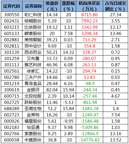 盘后龙虎榜数据显示,今日机构席位资金合计净卖出约1.28亿元。其中,净买入的个股11只,净卖出的个股10只。机构净买入最多的股票是和仁科技,净买入金额约8715.86万元;机构净买入居前的还有棕榈股份、比依股份、嵘泰股份等股。机构净卖出最多的股票是中直股份,净卖出金额约1.48亿元。机构净卖出靠前的还有索菱股份、怡亚通等股。