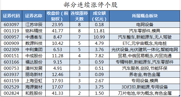 截至收盘,沪深两市合计3466只个股上涨,1090只个股下跌,平盘个股112只,停牌的个股53只。不含当日上市新股,共有115只个股涨停,15只个股跌停。连续涨停天数看,江苏华辰、铭科精技均已连收8个涨停板,连续涨停板数量最多。