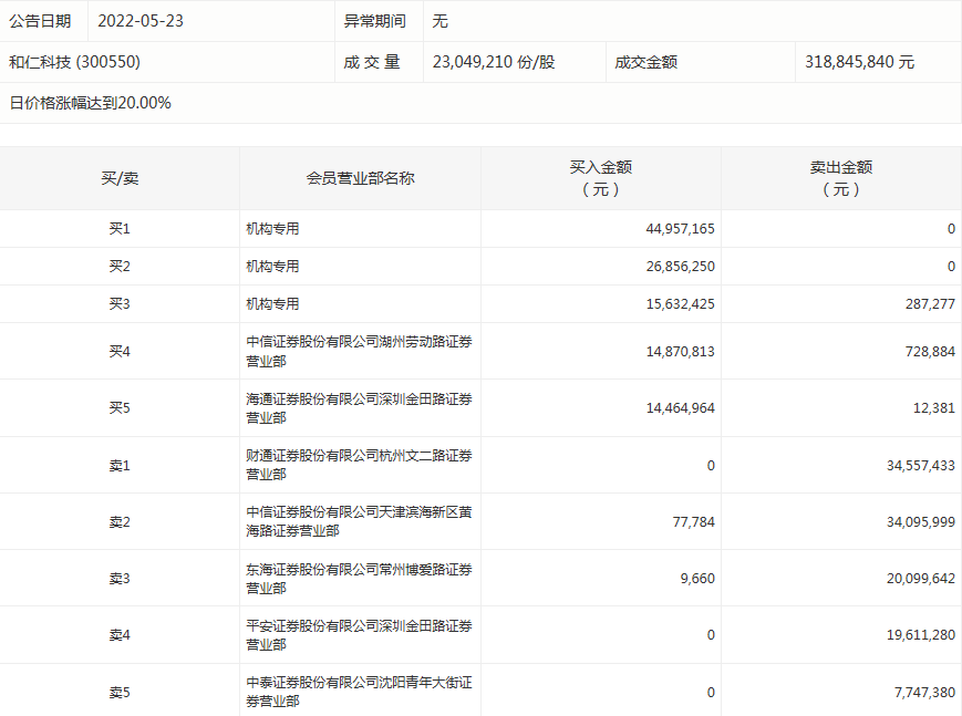 和仁科技今天涨停。盘后数据显示,3个机构出现在龙虎榜单上,合计净买入8715.86万元;海通证券股份有限公司深圳金田路证券营业部买入1446.5万元,同时卖出1.24万元;中信证券股份有限公司天津滨海新区黄海路证券营业部买入7.78万元,同时卖出3409.6万元。