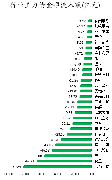 从行业板块来看,申万所属的28个一级行业,今日所有行业板块主力资金都呈现净流出,其中,医药生物行业板块主力资金净流出最多,净流出金额为80.89亿元;行业板块主力资金净流出靠前的还有化工、电子、电气设备、有色金属、建筑装饰,净流出金额分别为64.81亿元、55.8亿元、46.58亿元、43.06亿元、36.23亿元。