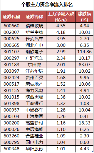 个股来看,今日有1071只个股获主力资金净流入,其中,20股获主力资金净流入超1亿元。福耀玻璃获主力资金净流入最多,净流入金额为4.55亿元;主力资金净流入居前的个股还有华兰生物、长安汽车、湖北广电、瑜欣电子、广汇汽车,净流入金额分别为4.18亿元、3.95亿元、3亿元、2.99亿元、2.34亿元。