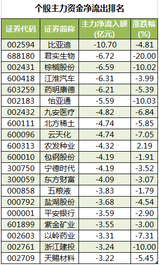 此外,3581只个股被主力资金净卖出,其中,124股被主力资金净卖出超1亿元。主力资金净流出最多的个股是比亚迪,净流出金额为10.7亿元;主力资金净流出居前的个股还有君实生物、棕榈股份、江淮汽车、药明康德、怡亚通,净流出金额分别为6.72亿元、6.59亿元、6.31亿元、6.21亿元、5.59亿元。