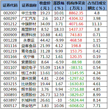 盘后龙虎榜数据显示,今日机构席位资金合计净卖出约3624.89万元。其中,净买入的个股9只,净卖出的个股9只。机构净买入最多的股票是华兰生物,净买入金额约8862.35万元;机构净买入居前的还有广汇汽车、中旗新材等股。机构净卖出最多的股票是荣安地产,净卖出金额约6068.02万元。机构净卖出靠前的还有长城科技、松原股份等股。