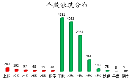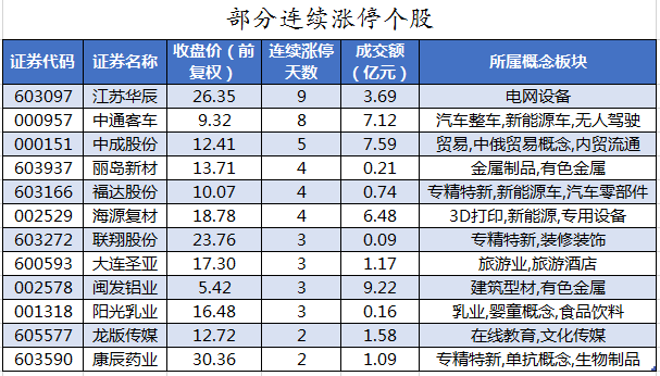 截至收盘,沪深两市合计280只个股上涨,4381只个股下跌,平盘个股8只,停牌的个股51只。不含当日上市新股,共有48只个股涨停,78只个股跌停。连续涨停天数看,江苏华辰已连收9个涨停板,连续涨停板数量最多。