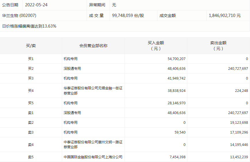 华兰生物今天涨停。盘后数据显示,5个机构出现在龙虎榜单上,合计净买入8862.35万元;华泰证券股份有限公司无锡金融一街证券营业部买入3883.89万元,同时卖出22.42万元;中国国际金融股份有限公司上海分公司买入745.44万元,同时卖出1345.22万元。