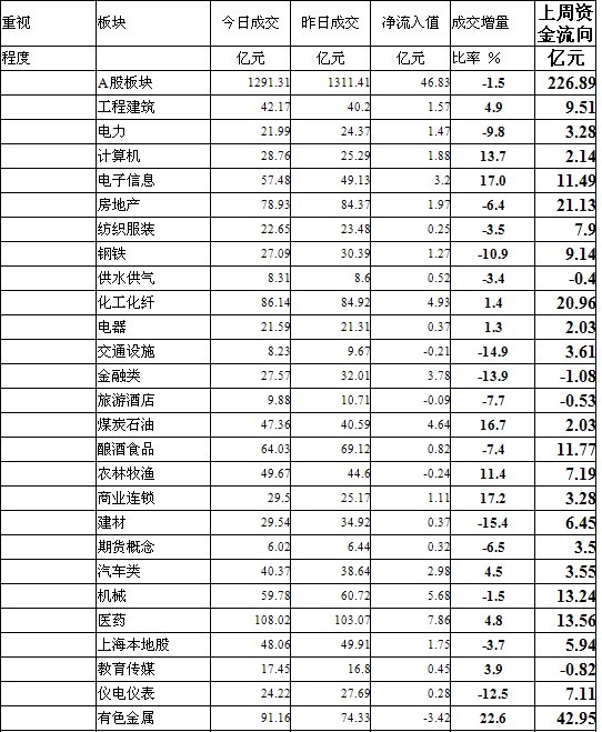 今日资金净流入较大的板块:中小板、南海探油、医药、机械、化工化纤。