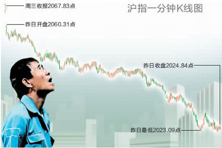 两市昨早盘双双低开后一路走低,午后沪指下行跌破2029点创近43个月新低2023.09点。权重股全线飘绿,船舶制造板块表现强势涨幅逾3%,个股行情惨淡,两市保持红盘股票数仅百余只,触摸屏、电子支付、稀土永磁等概念跌幅居前,股指创新低后尾盘出现一定程度的抛售潮。