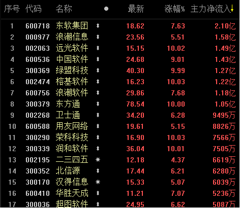 板块方面,国产软件表现最为强势,整体涨幅高5.66%,位居榜首。早盘,随着榕基软件、宝信软件的快速涨停,该板块人气直接被激发。截至收盘,远方软件、东方通、绿盟科技、荣科科技、润和软件等7股涨停,中国软件、浪潮软件涨逾7%。