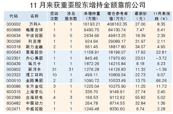 再如重要股东增持金额超亿元的12家公司中,除了金路集团,只有2家11月来略跌。涨幅两位数的还有莫高股份、东方金钰,万科A、理工环科、梅雁吉祥、瑞贝卡等涨幅远超同期大盘。