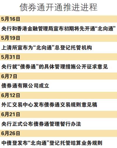 进入6月后,有关债券通的开通进程还在提速。6月7日,中国外汇交易中心与香港交易及结算所有限公司宣布,在香港成立债券通有限公司,承担支持债券通相关交易服务职能;6月12日,外汇交易中心发布债券通交易规则意见稿;6月21日,央行正式公布债券通管理暂行办法。