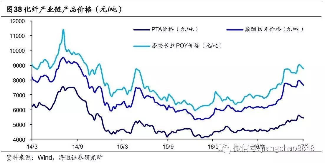 化工行业是典型的周期性行业,但子行业周期交错,同一时期的子行业间景气度大有不同。当前可关注景气度较高的化纤产业链。