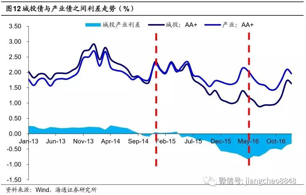 城投债取得相对于产业债的超额收益分为两个阶段:一是14年以前,市场对其风险的担忧导致高票息,这段时间AA+城投债票息较同评级产业债平均高出15BP;二是15年二季度至16年二季度,产业债违约风险暴露后其安全性凸显,收益率大幅下行,城投债与产业债之间的利差由正转负,最低到-80BP。而从16年三季度起,产业债信用风险暂缓,融资平台信用风险上升,城投产业利差逐渐上行,目前已由最低点上行至-30BP左右。