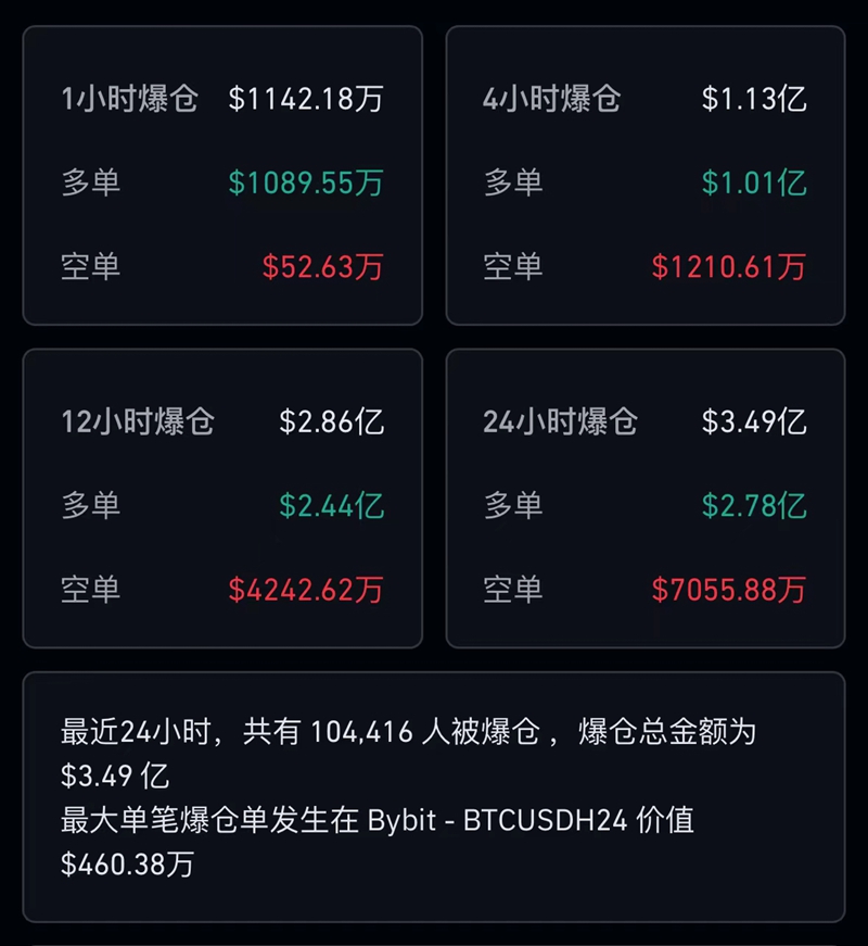 CoinGlass数据显示,最近24小时,比特币市场共有超10万人爆仓,爆仓总额为3.49亿美元(约合人民币25亿元)。