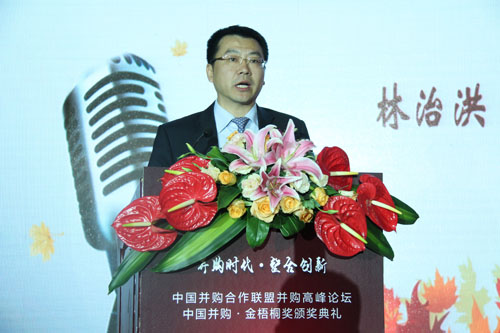 3月24日,由中国并购合作联盟主办,民生银行和中国证券报联合承办的中国并购合作联盟并购高峰论坛在北京举行。图为民生银行党委委员林治洪做主题演讲。摄/吕雷