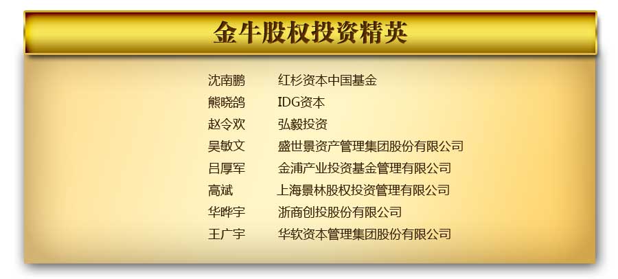 接下来,我们要颁出的是金牛股权投资精英,也是今晚的最后一个奖项: