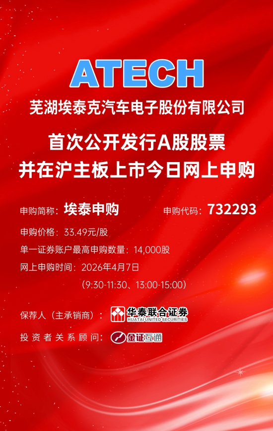 芜湖埃泰克汽车电子股份有限公司首次公开发行A股股票并在沪主板上市今日网上申购
