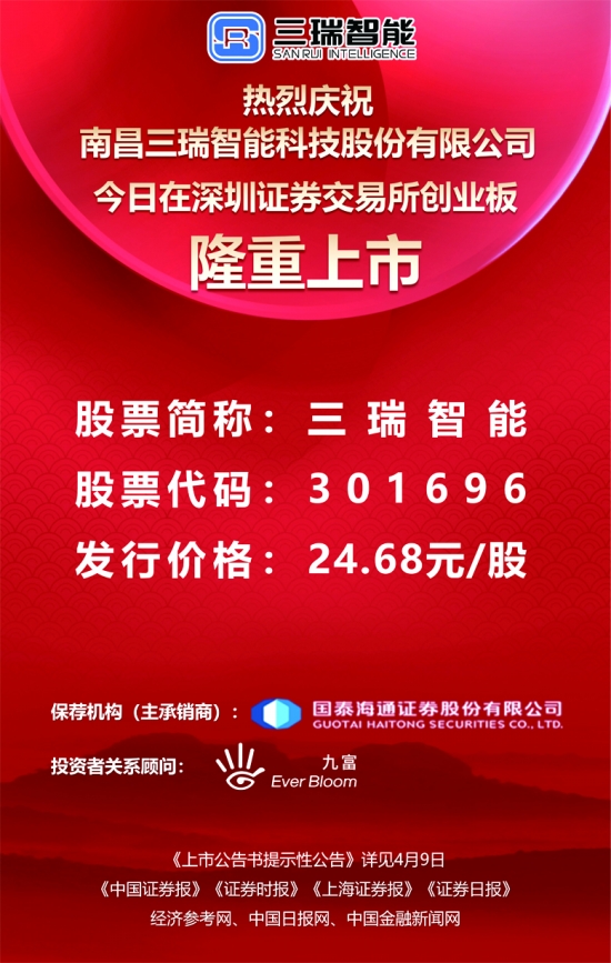 南昌三瑞智能科技股份有限公司今日在深圳证券交易所创业板隆重上市