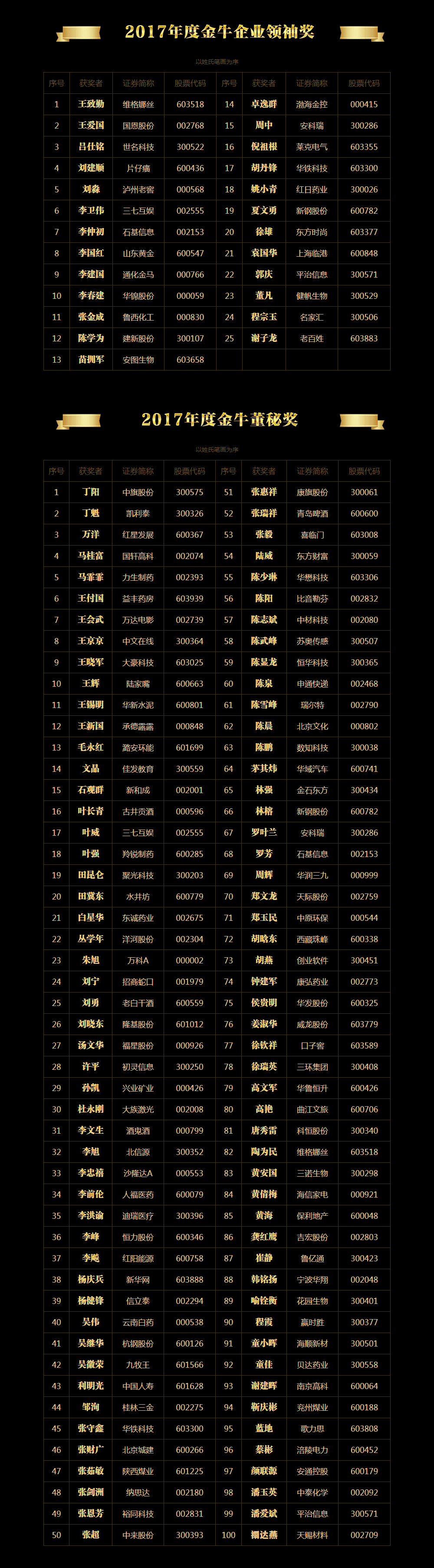 | 16:50-17:40 | 第二十届上市公司金牛奖颁奖② 颁发2017年度金牛董秘奖 颁发2017年度金牛董秘最佳人气奖 |