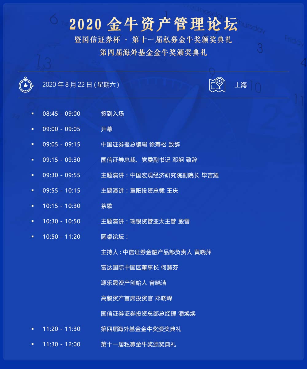 由中国证券报社主办,主题为“新机 新局 新使命”的“2020金牛资产管理论坛”于2020年8月22日在上海隆重举行,旨在汇聚行业菁英,纵论中国资产管理业在变革与开放时代的使命与机遇。与该论坛同时举办的有基金业金牛奖、私募金牛奖和海外基金金牛奖三场颁奖典礼,盛况空前。