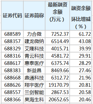 力合微等10只科创板股融资余额增幅超20%