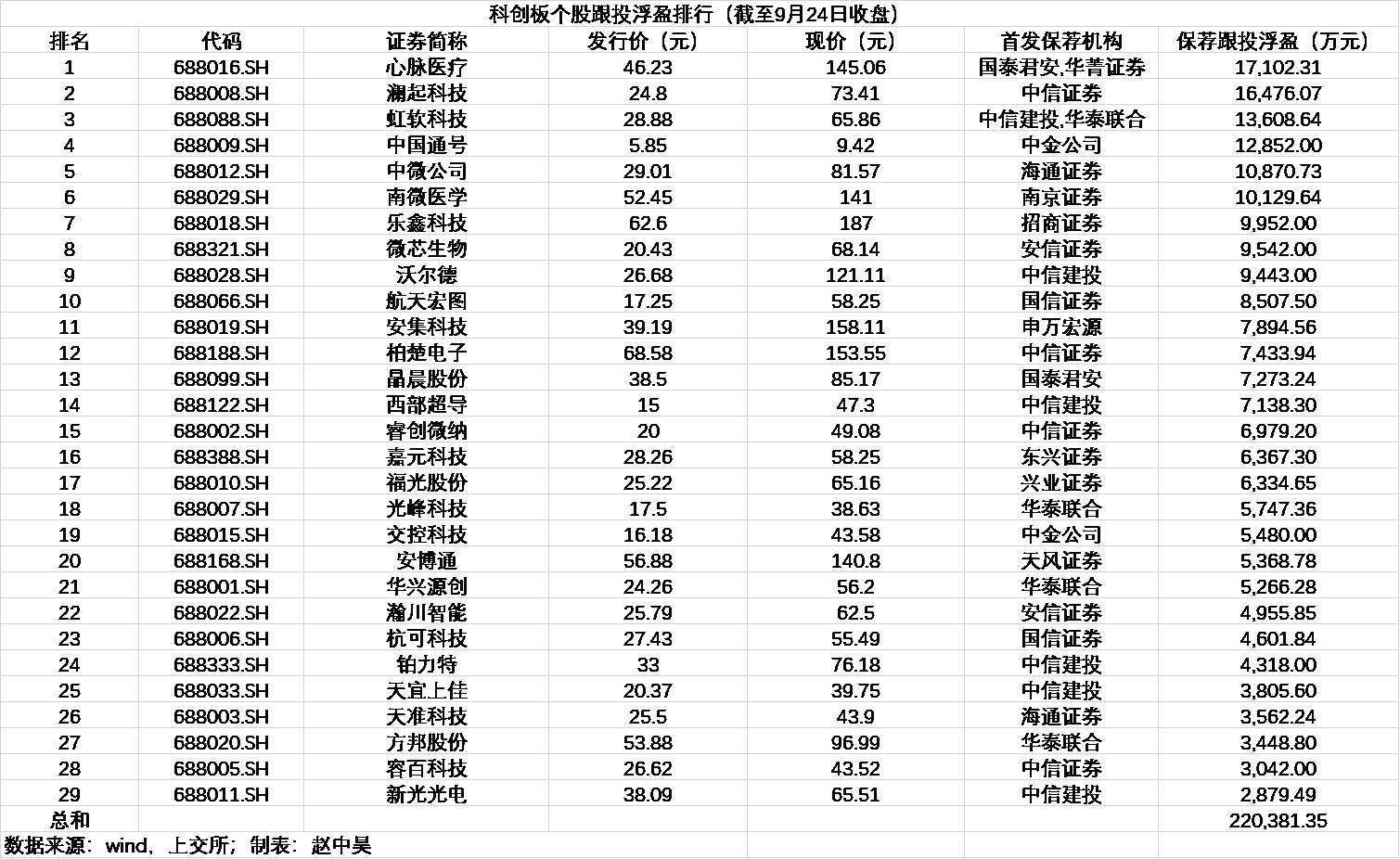 中证网讯(记者 赵中昊)按照9月24日收盘价计算,当前已有6只科创板股票的保荐跟投浮盈超1亿。其中,心脉医疗的保荐跟投机构以1.71亿元的浮盈居首;其次是澜起科技,其保荐机构的跟投浮盈是1.65亿元;第三是虹软科技,其保荐机构的跟投浮盈是1.36亿元。此外,中国通号、中微公司、南微医学的保荐跟投机构的浮盈分别为1.29亿元、1.09亿元、1.01亿元,分列第二至第六位。