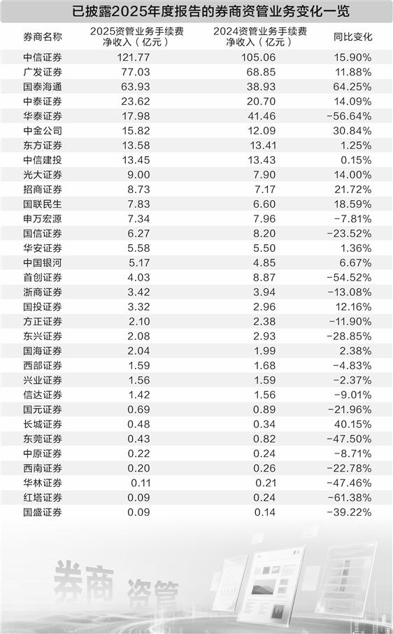 纵观头部券商阵营,明显呈现分化表现的是华泰证券。该券商2025年资管业务手续费净收入为17.98亿元,同比下降56.64%。业界人士分析,这主要是由于华泰证券出售了控股美国子公司AssetMark,导致并表收入大幅减少。中金公司、招商证券则有相对不错的表现,2025年资管业务手续费净收入增速分别达到30.84%、21.72%,光大证券和国投证券也都实现了10%以上的增长。