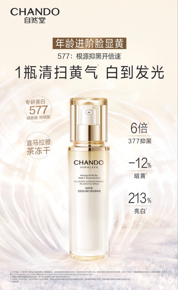 [1] 尚普咨询集团:通过行业专家和企业调研,对比全球范围内、全渠道市场中,各品牌以 577 为主要美白成分的面部美白产品的整体经营情况,得出:上海自然堂集团有限公司为全球 577 美白领导者;以 577 为主要美白成分的面部美白产品中,有 4 具行业影响力的(577)为主要美白成分的面部美白产品;领导者在全球范围内,以市场、技术及产品端均处于领导地位,且 “4 - 丁基间苯二酚”(577)统计时间:2024 年 1 月 1 日 - 2024 年 12 月 31 日;本证明于 2025 年 4 月完成调研。品牌均以 4 - 丁基间苯二酚为主功效的原料