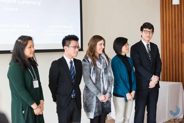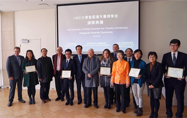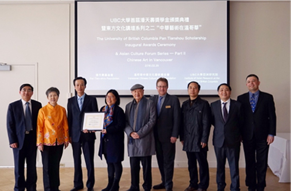 五位不同国籍不同研究领域的博士生荣获不列颠哥伦比亚大学首届潘天寿奖学金。该潘天寿奖学金是由温哥华中华文化艺术基金会和潘天寿基金会联合创立的,这也是潘天寿基金会在海外设立的首个奖学金。二月二十五日,颁奖典礼在风景如画的加拿大温哥华不列颠哥伦比亚大学举行,中华人民共和国驻温哥华总领事刘菲、不列颠哥伦比亚大学人文学院院长艾嘉祺(Dr. Gage Averill)、潘天寿基金会会长励国仪、世界华语诗坛泰斗洛夫、不列颠大学亚洲研究院院长肖逸夫(Dr. Yves Tiberghien)、温哥华中华文化艺术基金会常务副主席兼秘书长周岳平、常务副主席陈荣华及副主席胡德林,中国教育部长江学者讲座教授、加拿大国家特聘教授、温哥华中华文化艺术基金文化传播委员会主任赵月枝等重要嘉宾出席了典礼。温哥华美术馆亚洲馆总监、温哥华中华文化艺术基金会视觉艺术顾问、著名艺术家、策展人郑胜天教授出席颁奖典礼并作了“中华艺术在温哥华”的主题讲座,阐述了温哥华成为中华文化艺术高地的悠久历史。