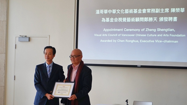温哥华中华文化艺术基金会常务副主席陈荣华为视觉艺术顾问郑胜天颁发聘书