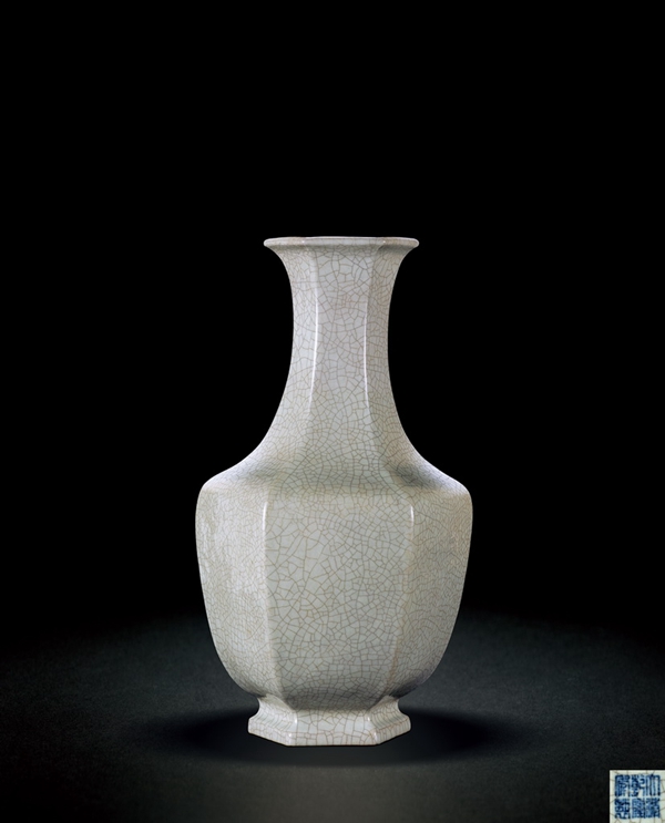 另有一清乾隆仿哥釉六方瓶,亦为清三代单色釉精品。其器形古朴,端庄大方,通体施仿哥釉,釉质滋润厚腴,厚润素雅,古意悠然。底以青花书“大清乾隆年制”六字三行篆书款。此类亦可见仿汝等釉色装饰者,皆为乾隆仿宋之佳品。