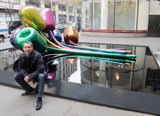 杰夫-昆斯在他的雕塑《郁金香》前拍照,该作品与赠送给巴黎市的礼物的设计类似。图片:Jamie McCarthy / Getty Images