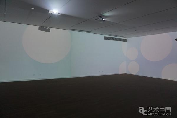 离开鸟儿的栖息地,影像作品《丛》中白色的圆点在蓝色的画布上缓慢移动,像是四维抽象画。这是下一件作品《趋势》的实时监控录像经过处理后的图像,白色瓷碗以一种更加抽象的姿态缓慢的移动,在这虚拟的静谧空间仿佛听到了风铃碰撞的乐曲。