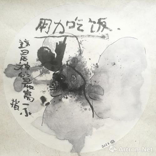 用力吃饭,纸本水墨,2017,35×35cm