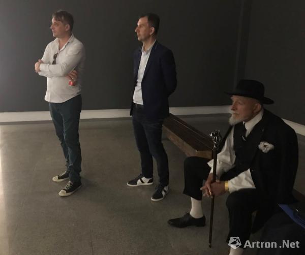 吕佩尔茨和策展人范·齐格迈尔(左一)等观看视频