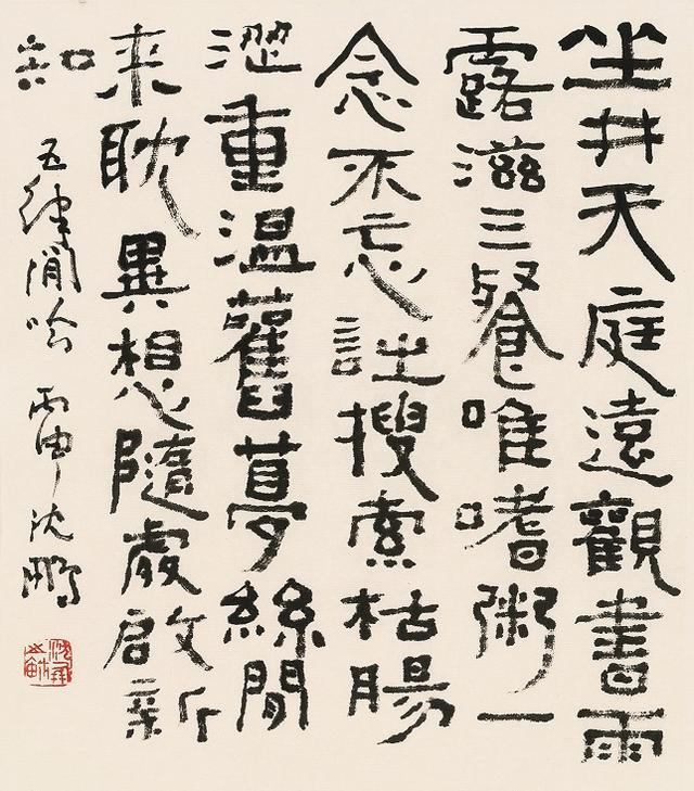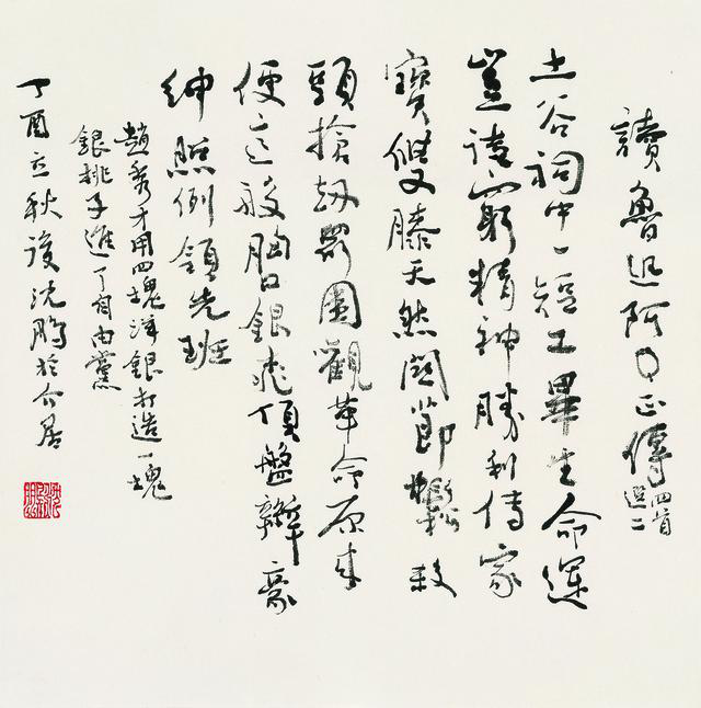 观沈先生的书法雄强古拙、儒雅风流,他将用笔、结体、章法、神韵等精神气息统摄于自己的诗意情感之下,信手拈来,随心所欲。他的草书、行书、隶书,若以古法绳之,古意十足;若以今意赏之,今不同弊;若以文气相之,诗意汩汩,气象峥嵘。如此恰到好处,回味无穷,给当代书坛提供了一个汲古非古、处今异今、学养与技艺融会贯通的成功范例。