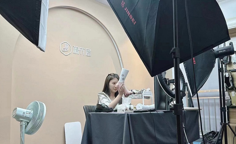 棉竹屋工作人员正在直播 本报记者 王科 摄
